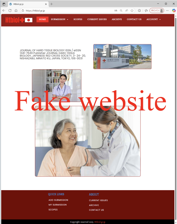 The name and ISSN of our society's official journal, “Journal of Hard Tissue Biology,” are being used, and a fake email address is being shown.